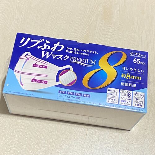 リブふわWマスクPREMIU ふつうサイズ試させて貰いました♫ 65枚入り/税抜880円✨ 耳紐が柔らかくてつけてて気持ちいい⑅◡̈* 鼻と口元にワイヤーが入っていて鼻のワイヤーは強力で隙間を作りづらく、メガネが曇りにくい 口元のワイヤーは口に直接当たることない…